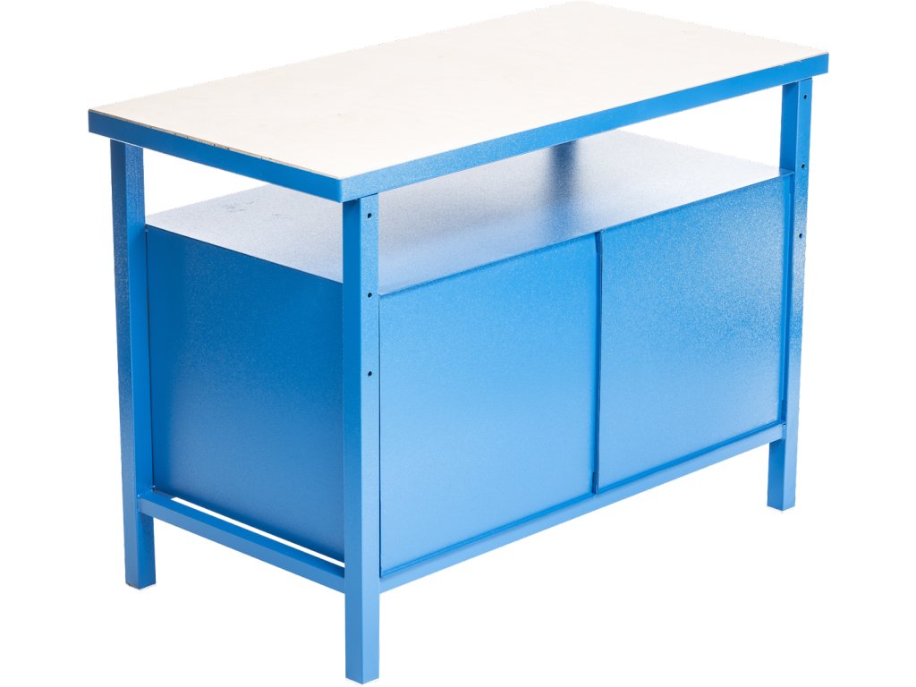 Radna ploča furnirana s obje strane – bukva, visoko zbijena iverica iznutra, zavareni okvir izrađen od čeličnog profila 40 × 40 s praškastim premazom, pocinčano dno s odjeljcima, sastavljen stol. Oprema: vrata s cilindričnom bravom, 1 polica u ormaru, 1 polica u otvorenom dijelu.