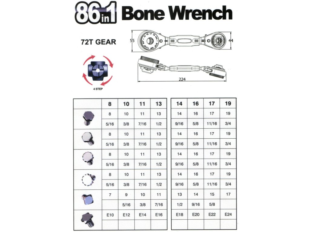 Karakterizira ga širok raspon primjena za do 86 opcija tipova i dimenzija vijčane glave. Okretanjem matica na obje savijene strane možete birati između ključnih veličina od 8, 10, 11, 13, 14, 16, 17 i 19 mm, 5/16", 3/8", 7/16", 1/2", 9/16", 5/8", 11/16" i 3/4". Ukupne dimenzije 44/45 × 224 mm. Izrađena je od visokokvalitetnog legiranog čelika.