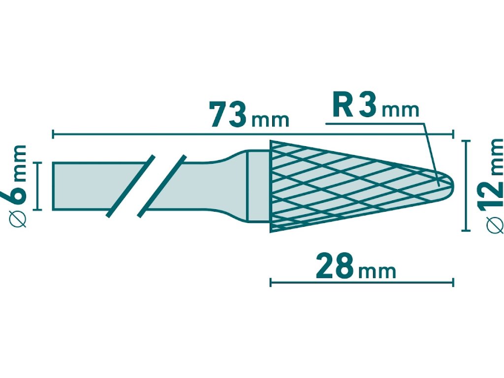Rezač karbida, stožast zaobljen 14°, promjera 12 × 28 mm/drška 6 mm, dvostruko izrezan