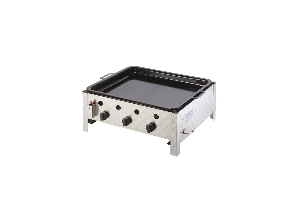GASTRO Profi roštilj ZDJELICA s emajliranom tavom unutarnjih dimenzija 580 × 460 × 50 mm. Brušeni nehrđajući čelik, termalni osigurač, piezo paljenje, 3 plamenika. Pribor za prebacivanje na cilindre od 5 kg i 10 kg uključen je u opseg isporuke