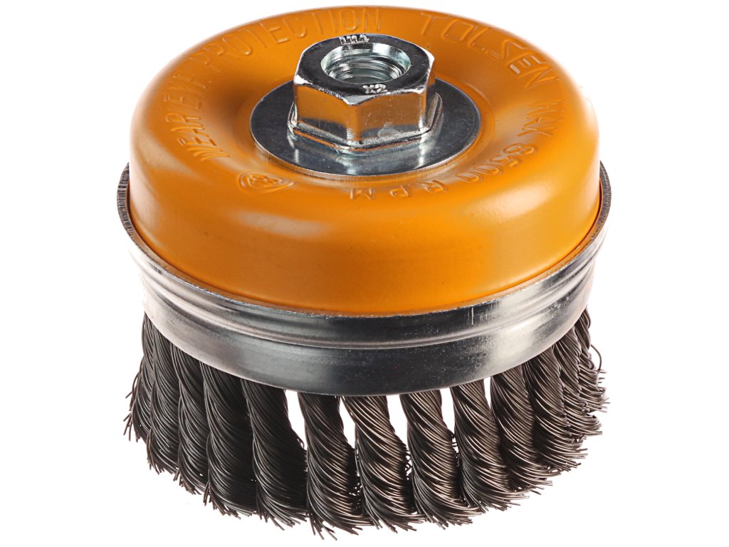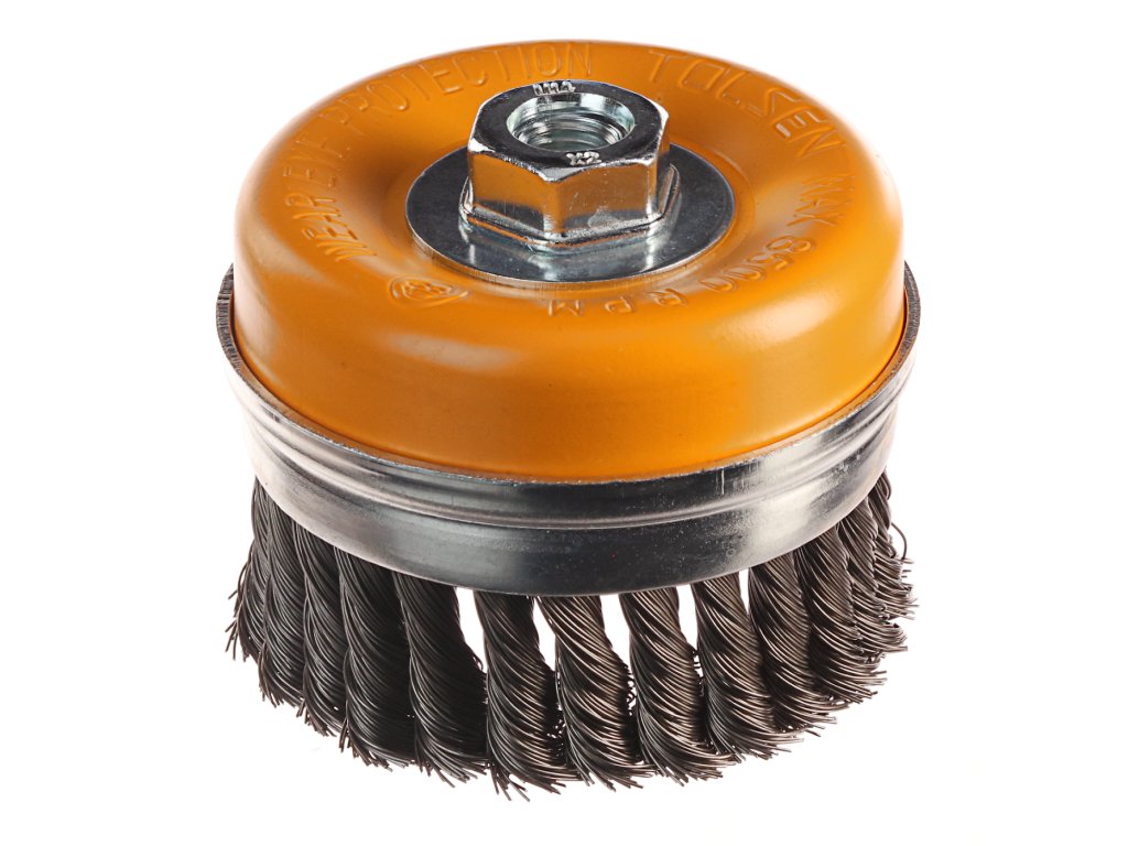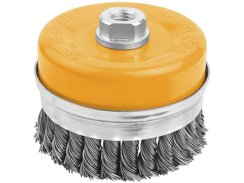 Idealno za uklanjanje hrđe i boje s metalnih površina. Promjer žice: 0,5 mm, duljina pletenice 30 mm, promjer četke i tijela 100 mm, matica za pričvršćivanje M14 × 2 mm, ukupna visina četke 83 mm, maksimalna brzina 8.500 o / min.