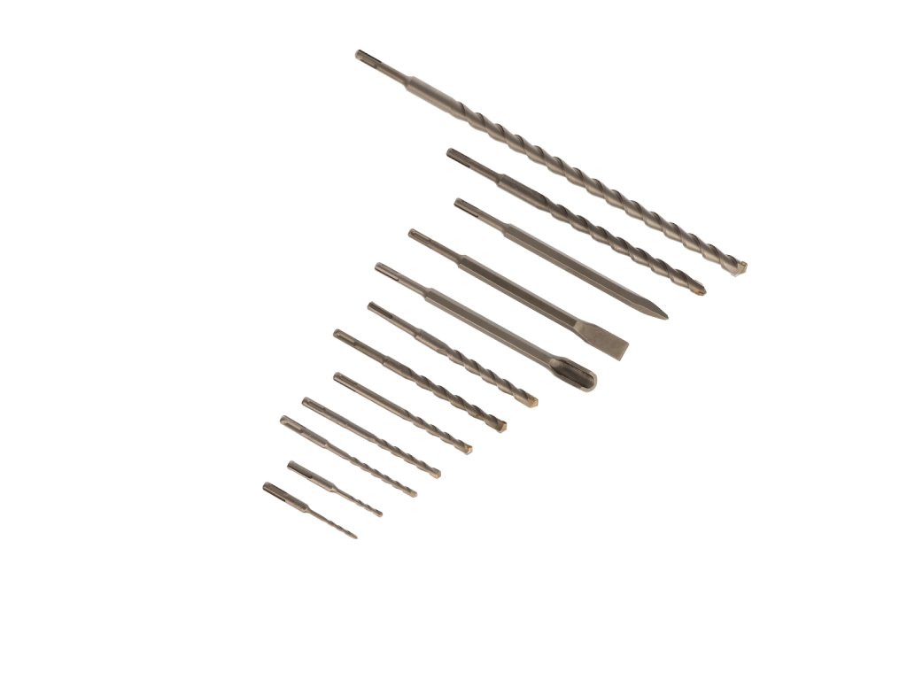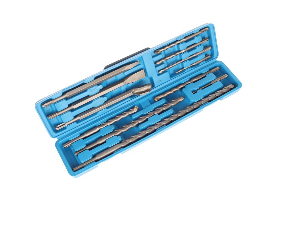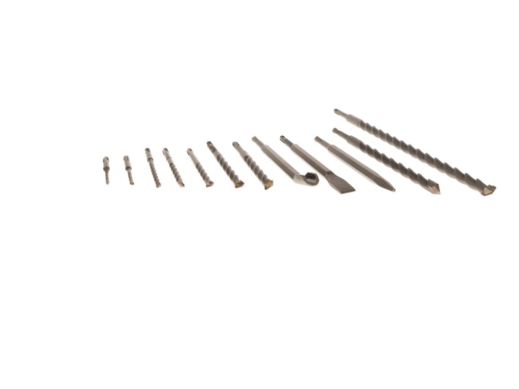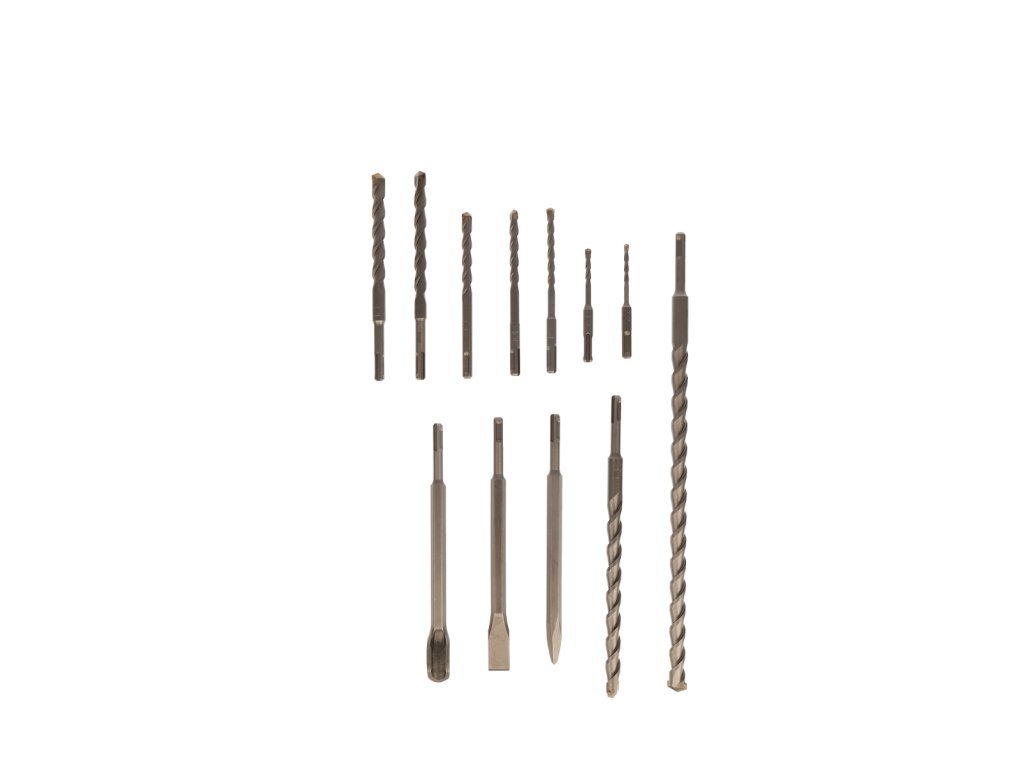 Svrdla: 5,5; 6 x 110 mm; 8; 10 i 12 x 160 mm; 14; 16 x 210 mm; 18 x 300 mm i 20 x 450 mm. Dlijeta: 1 x vrh, 1 x ravan i 1 x utor. U robusnom slučaju.