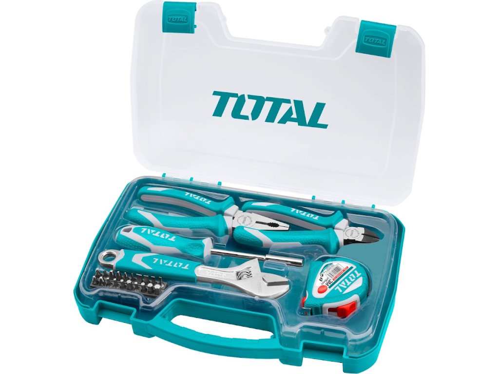 Jednostavan set za kućnu upotrebu. Kvalitetan CrV čelik. Uključuje kombinirana kliješta, kliješta za rezanje, mjernu traku, podesivi ključ i odvijač kao držač za set vrhova.