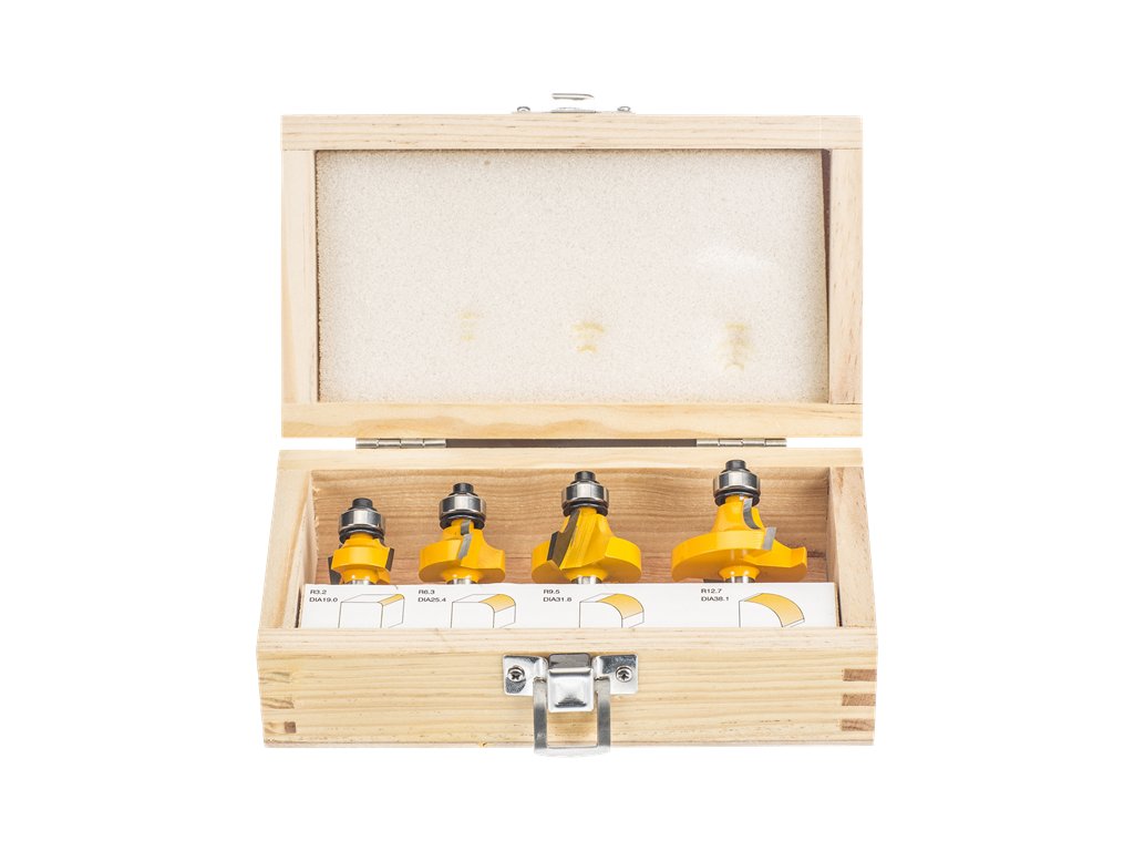 Za istu dubinu rezanja i navođenja, rezači su opremljeni ležajem. Set uključuje rezače promjera 3/4", 1", 1 1/4", 1 1/2", duljine rezanja od 13/32", 17/32", 21/32", 3/4" i polumjere od 1/8", 1/4", 3/8" i 1/2". Promjer drške od 8 mm, oštri rub karbida, ležajevi od 1/2" (R3ZZ) i 3/8". Isporučuje se u drvenoj kutiji dimenzija 158 × 88 × 50 mm.