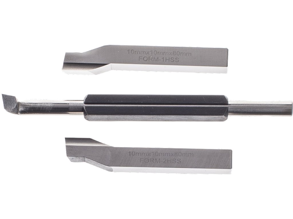Sadrži noževe za obradu metala, lijevi i desni bočni rezač 10 × 10 × 80 mm, unutarnji rezač s držačem 8 × 140 mm, materijal alat čelik HSS.