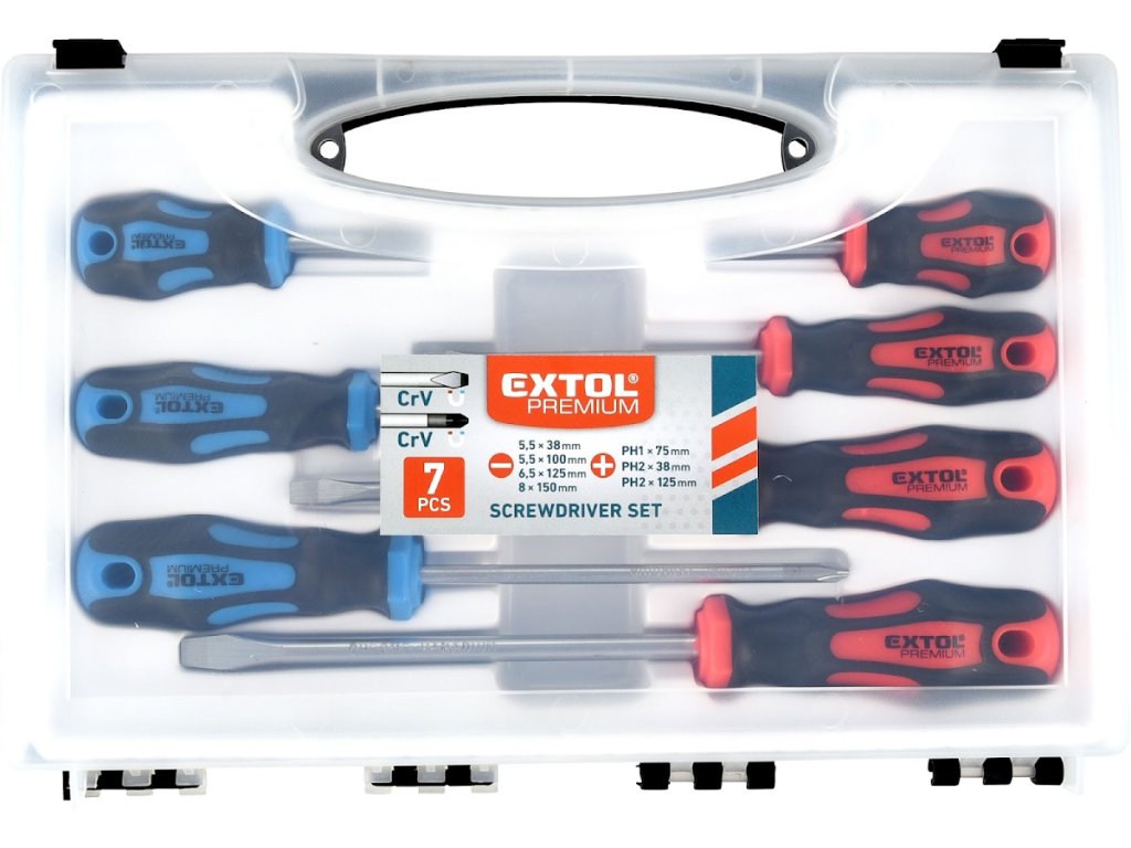 - (-)5,5 × 38 mm, (-)5,5 × 100 mm, (-)6,5 × 25 mm, (-)8 × 50 mm, PH1 × 75 mm, PH2 × 38 mm, PH2 × 25 mm