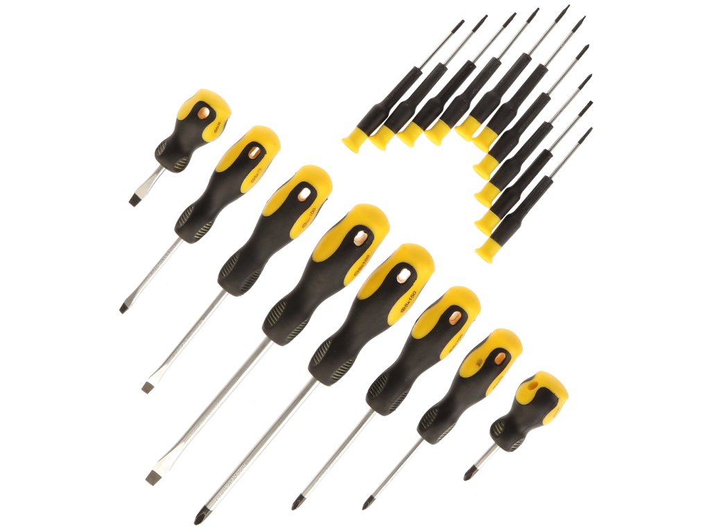 Sadrži visokokvalitetne odvijače: ravne 6 × 38; 5 × 75; 6 × 100, 8 × 150 mm; Phillips odvijači PH2 × 38, PH1 × 75, PH2 × 100, PH3 × 150 mm i set od 10 preciznih odvijača. Materijal: CrV čelik, PP+TPR plastična ručka, plastični stalak.