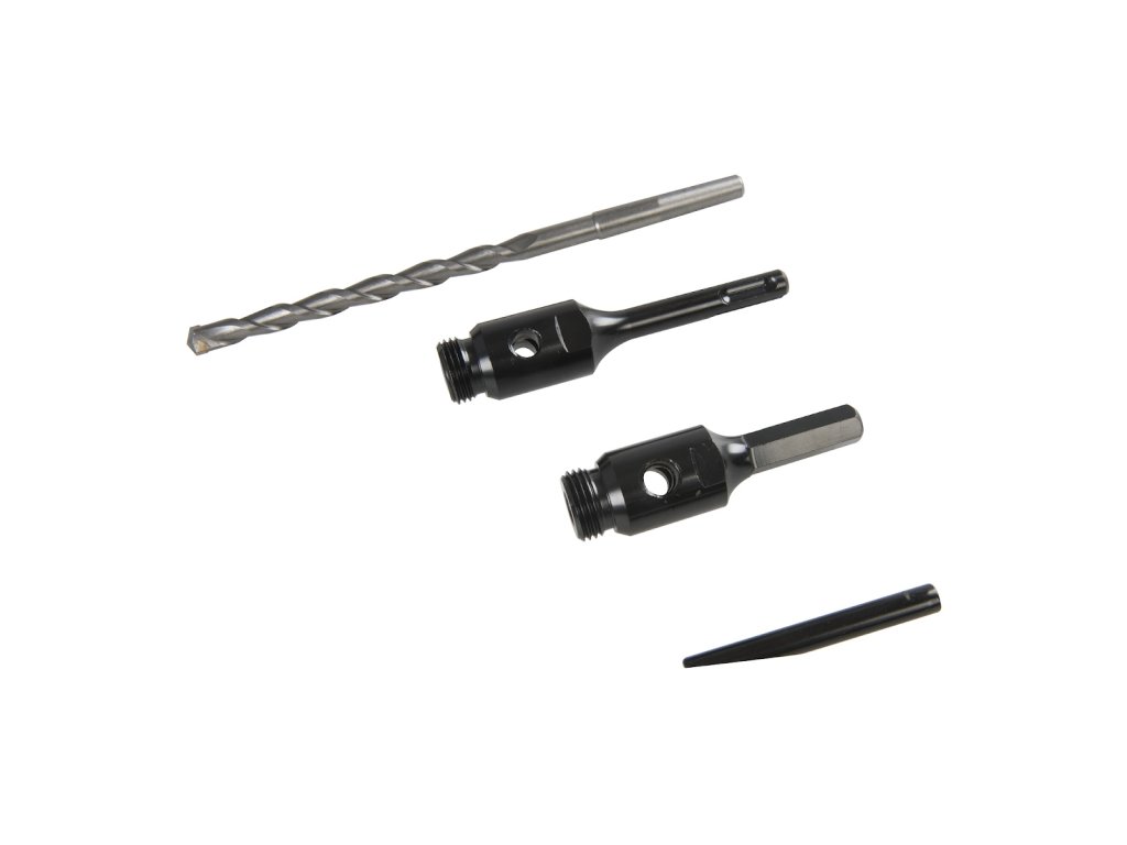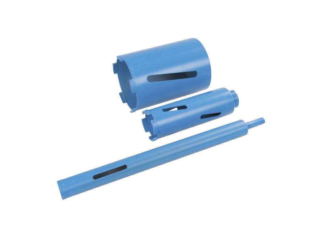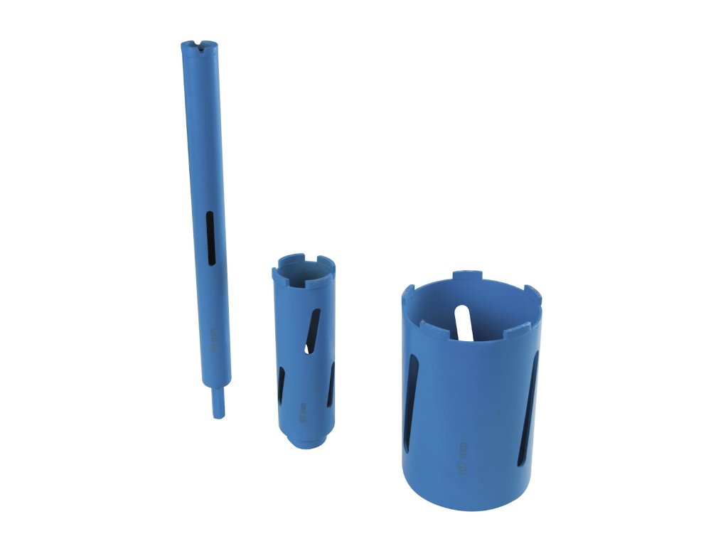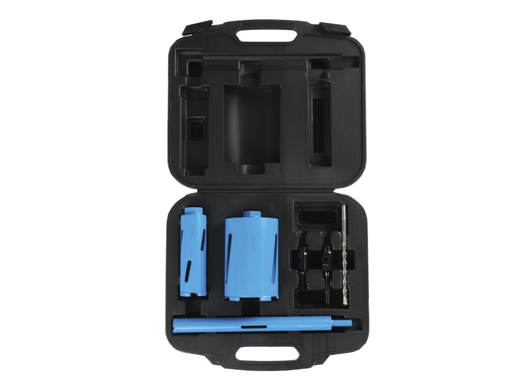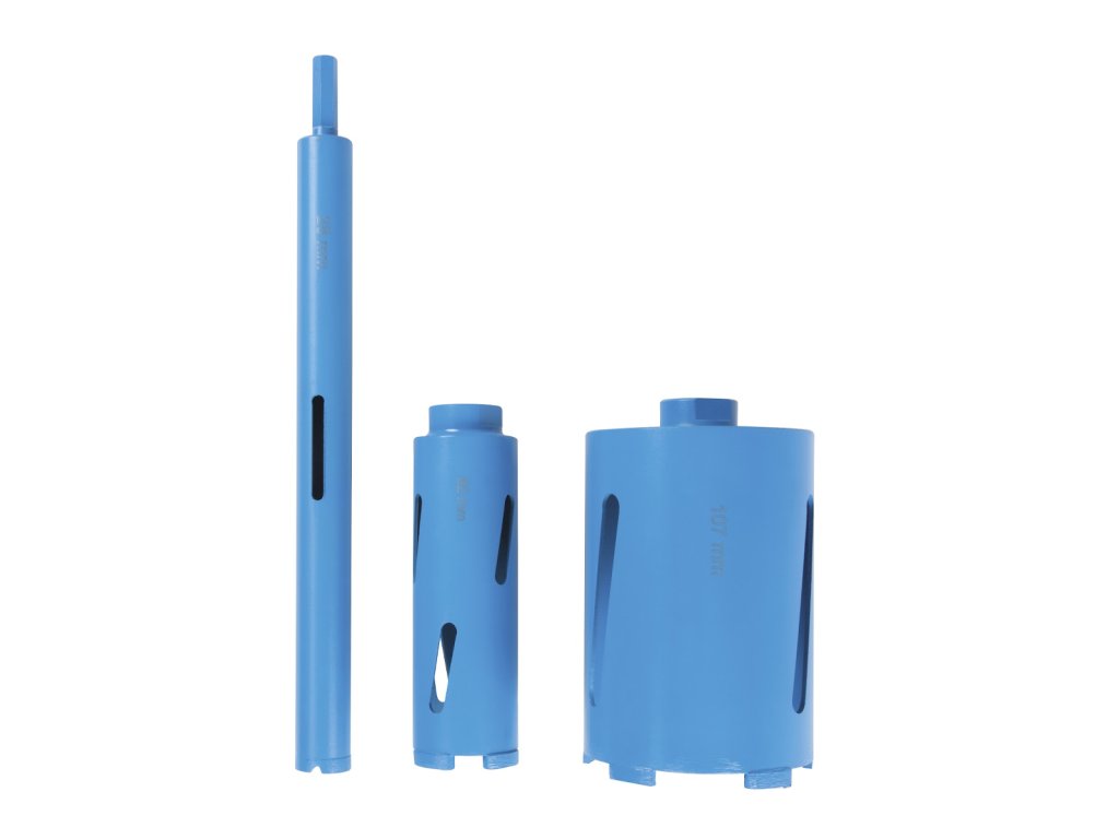 Izdržljiva svrdla jezgre s čeličnim tijelom i dijamantnim reznim zubima. Idealno za suho rezanje preciznih rupa u zidovima. Koristite s bušilicama sa sigurnosnom spojkom. Ne koristite čekić! Set uključuje 3 svrdla jezgre promjera (28, 52 i 107 mm), 2 drške (SDS plus i Hex), središnju bušilicu i klin za nokaut.