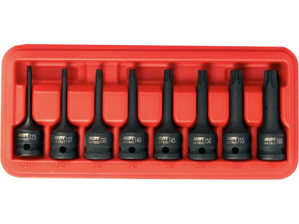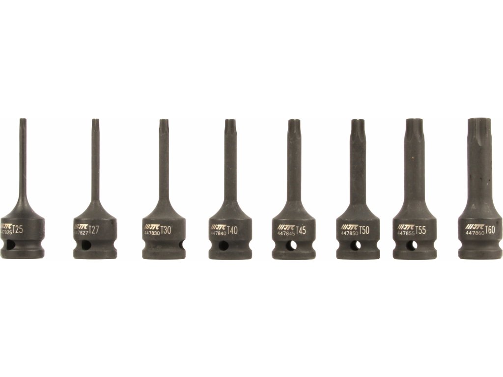 Set od 8 TORX utičnica može se koristiti zajedno s 1/2" golom. Sadržaj plastične kutije su ključevi u veličinama T-25, 27, 30, 40, 45, 50, 55, 60.