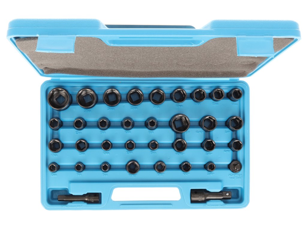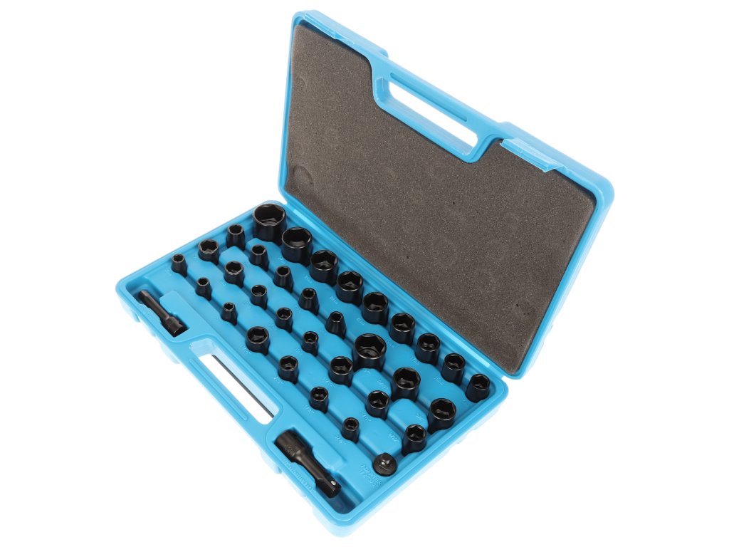 Mat crna završna obrada, kromirani vanadijev čelik. Komplet uključuje 12 × 3/8" metričkih utičnica 8, 9, 10, 11, 12, 13, 15 i 17 mm metričkih utičnica, 3/8", 1/2", 9/16" i 11/16" metričke utičnice, 20 × 1/2" metričke utičnice 9, 10, 11, 12, 13, 14, 15, 17, 19, 21, 22, 24, 27 i 30 mm, 9/16", 5/8", 11/16", 3/4", 13/16" i 1", kao i 2 × produžne utičnice 1/2" × 3" i 3/8" × 3" i 1 x adapter 1/2" - 3/8".