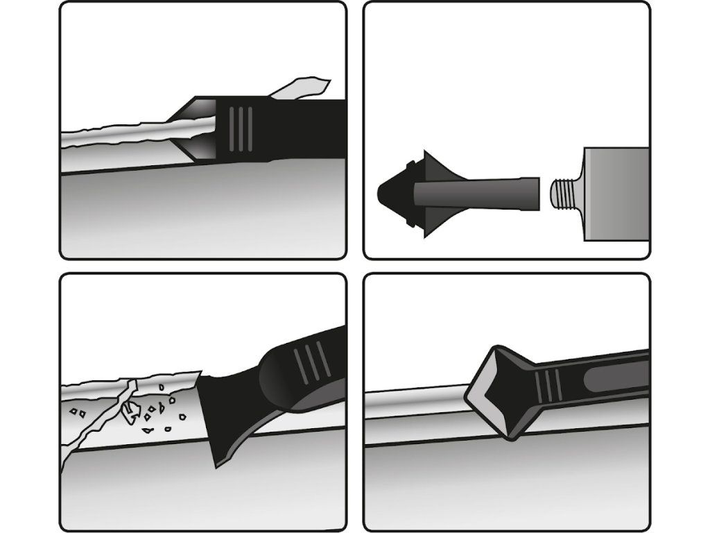 - set uključuje pet silikonskih nastavaka za zaglađivanje brtvila radijusima u mm R3 - R6 - R10 - R13 - R17 (oni se mogu pričvrstiti na priključak spremnika ili na drugi kraj ručke strugačem); Komplet također uključuje nastavak uloška, ručku na silikonskim nastavcima s strugačem i ručku s kutnim rezačem brtvila s vretenom za čišćenje