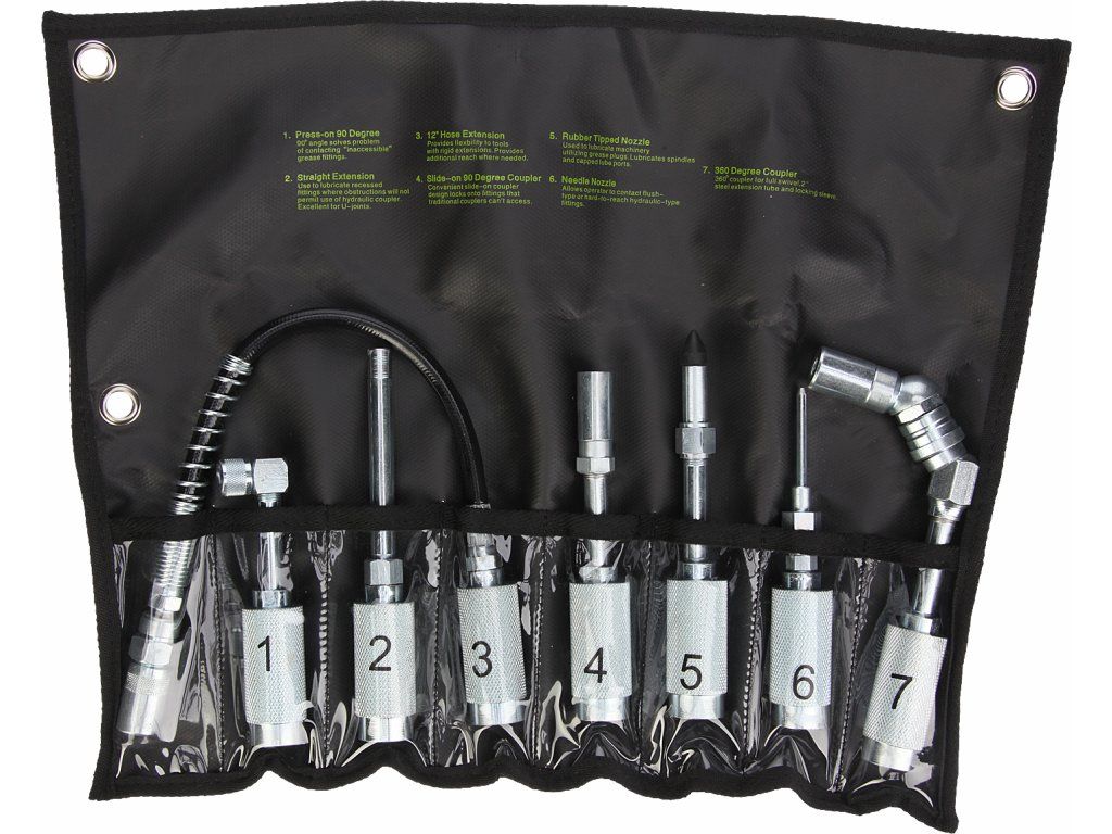 Komplet pribora za podmazivanje koji sadrži sedam priključaka. U setu ćete pronaći 2 komada nastavka za nanošenje do 90 °, ravni produžni priključak, produžni nastavak od 12", nastavak s gumenom prskalicom, nastavak za raspršivanje iglom, nastavak za nanošenje do 360 °. Priključak na standardne masne glave preša.