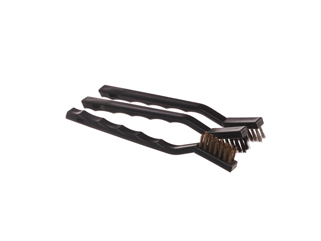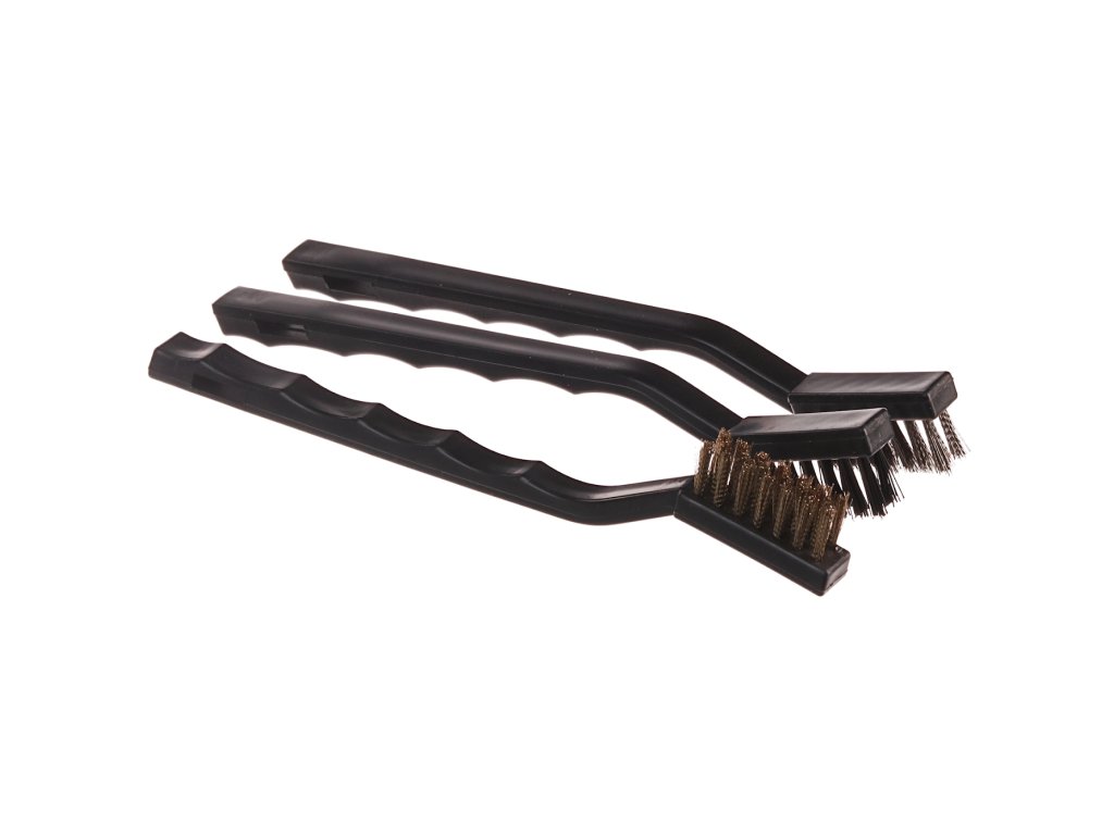 Pogodno za uklanjanje hrđe i stare boje. Komplet uključuje: 1 kom najlonsku četku od 180 mm; 1 kom čelična četka od 180 mm i 1 kom četka od nehrđajućeg čelika 180 mm. Radni dio četkica 8x32x14 mm. Upakirano u žulj.