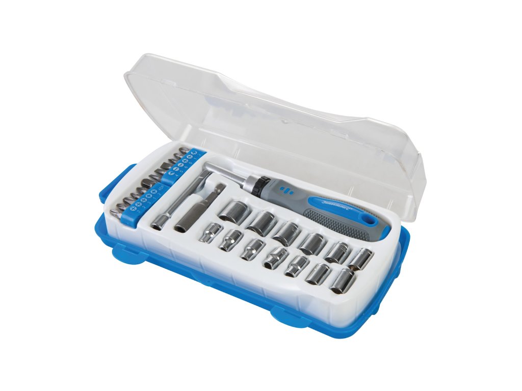 Komplet uključuje 13 x karbonskih čeličnih ključeva (4; 4,5; 5; 5,5; 6; 7; 8; 9; 10; 11; 12; 13 i 14 mm), kromirane vanadijeve čelične bitove 11 x 25 mm (SL4, 5 i 6; PH0, 1, 2, 2, 2 i 3; PZ1 i PZ2), adapter, produžna šipka od ugljičnog čelika od 75 mm, držač magnetskih bitova i čegrtaljka od kromiranog vanadijevog čelika od 60 mm u kućištu za pohranu.