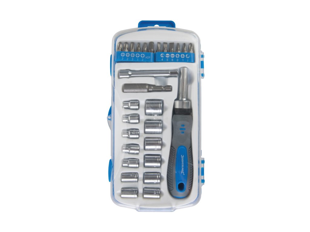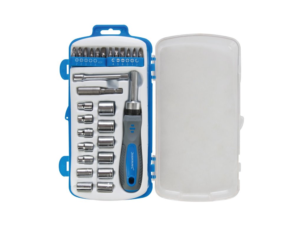 Komplet uključuje 13 x karbonskih čeličnih ključeva (4; 4,5; 5; 5,5; 6; 7; 8; 9; 10; 11; 12; 13 i 14 mm), kromirane vanadijeve čelične bitove 11 x 25 mm (SL4, 5 i 6; PH0, 1, 2, 2, 2 i 3; PZ1 i PZ2), adapter, produžna šipka od ugljičnog čelika od 75 mm, držač magnetskih bitova i čegrtaljka od kromiranog vanadijevog čelika od 60 mm u kućištu za pohranu.