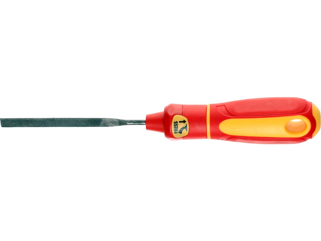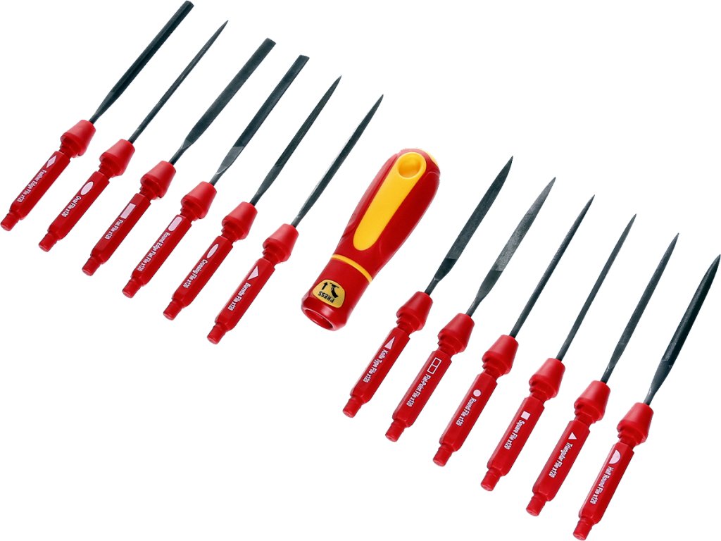 Skup od 12 klasičnih igličastih datoteka različitih oblika. Da biste ih brzo stegnuli, upotrijebite ručku koja je uključena u paket. Materijal datoteke je visokolegirani ugljični čelik, tvrdoće 60 – 65 HRC. Rukujte materijalom PP/TPR/POM.