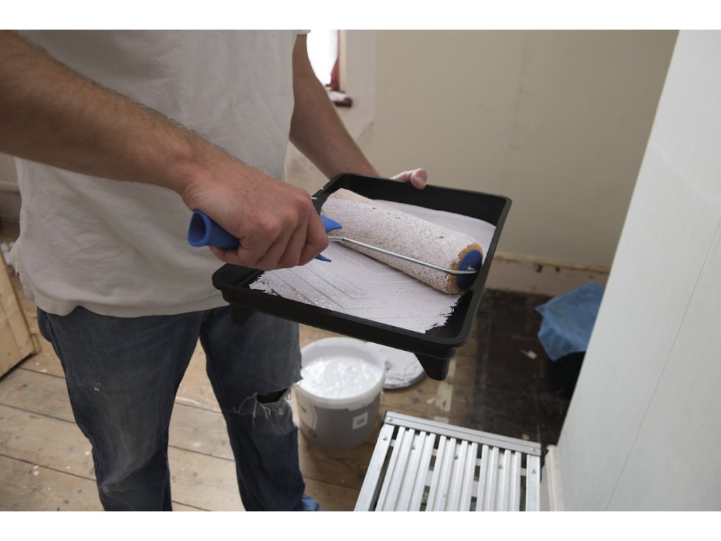 Set uključuje teksturiranu polipropilensku posudu za boju i valjak od 230 mm za upotrebu ulja i vode
