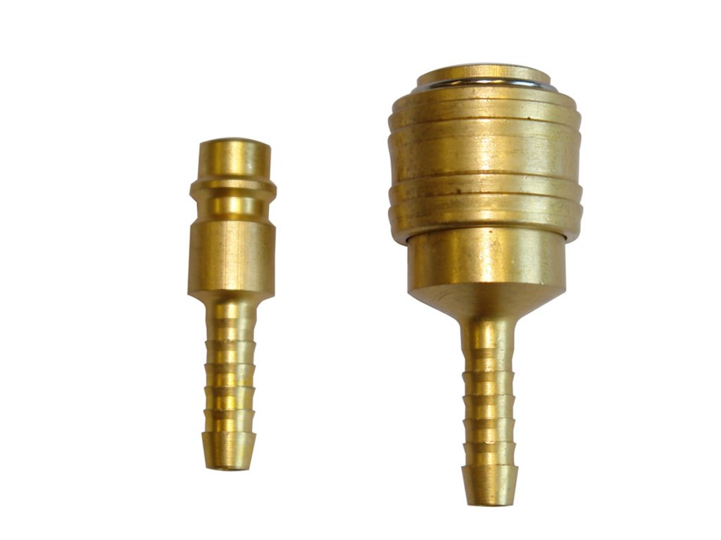 Konstrukcija brze spojke: mesingana karoserija (MS58), čelična opruga, brtva (→ perbunan), bradavica crijeva.