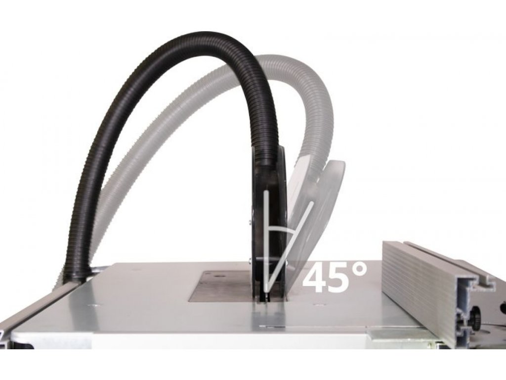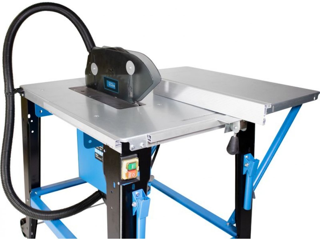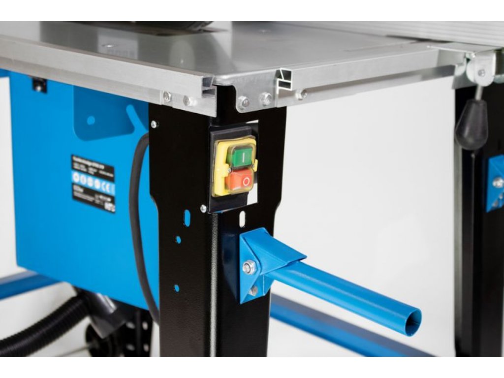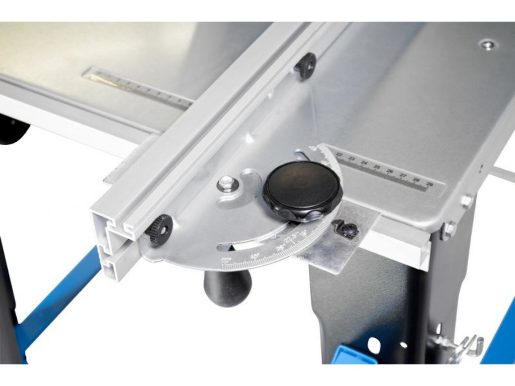 Beskonačno podesiva visina/kut nagiba lista pile 90 ° - 45 ° (rezovi od → mitre), pocinčani radni stol (→ L × W: 800 × 553 mm), jednostavno rukovanje zahvaljujući kotačićima / preklopnim transportnim ručkama.