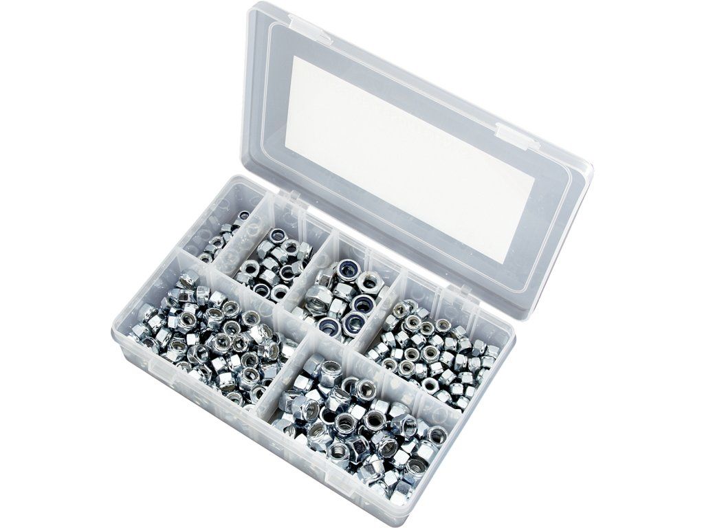 Set od 260 komada čeličnih samoblokirajućih matica s najlonskim umetkom u plastičnom organizatoru s poklopcem. Paket uključuje veličine M6, M8, M10, 1/4"UNF, 5/16"UNF, 3/8"UNF.