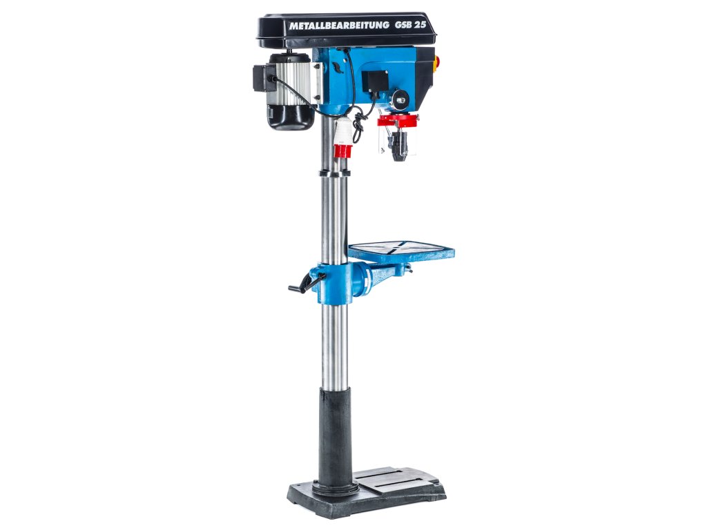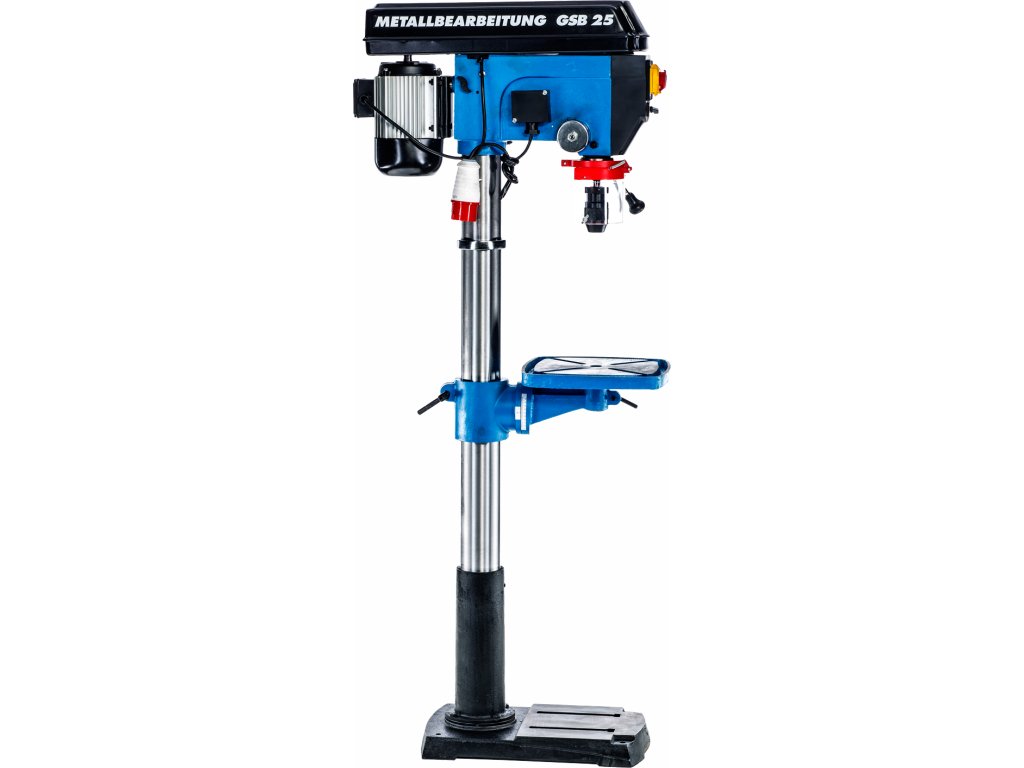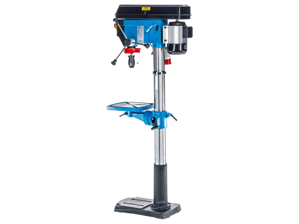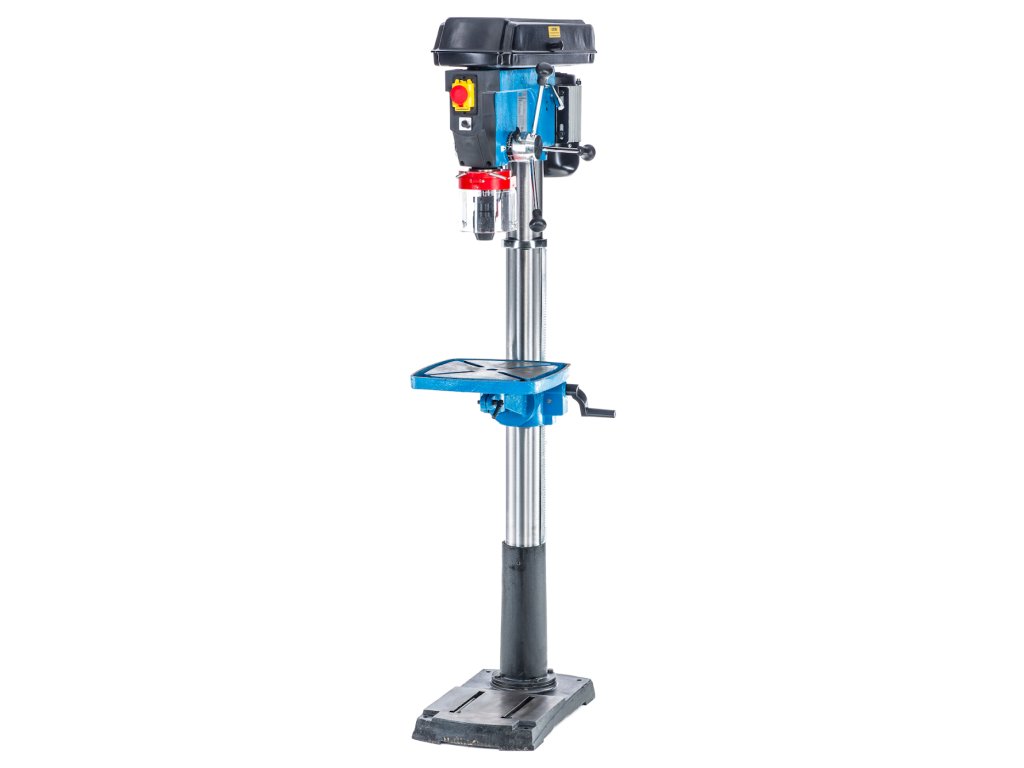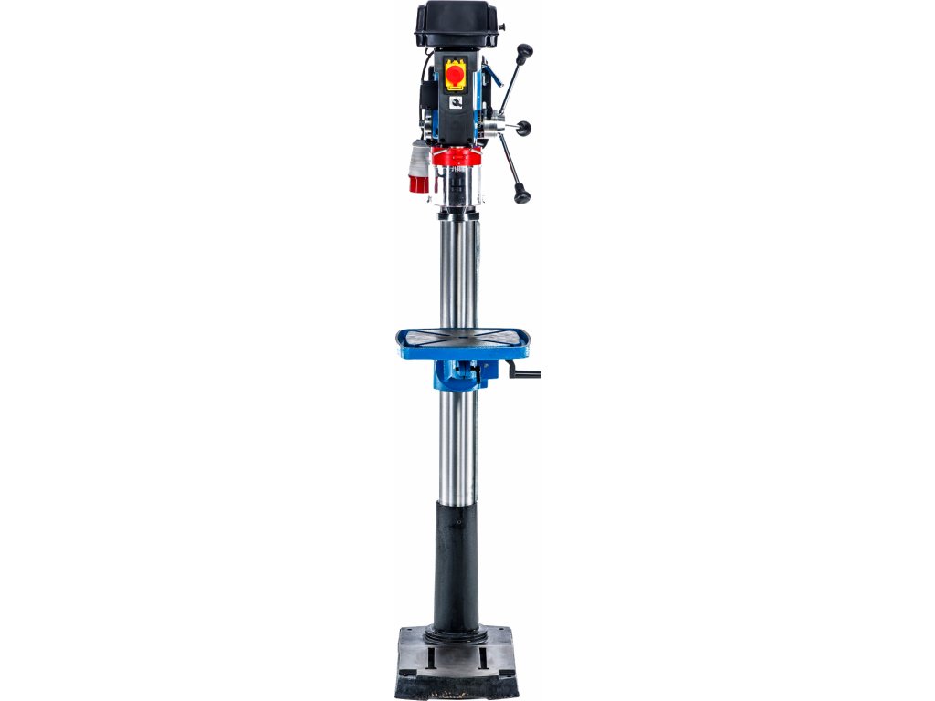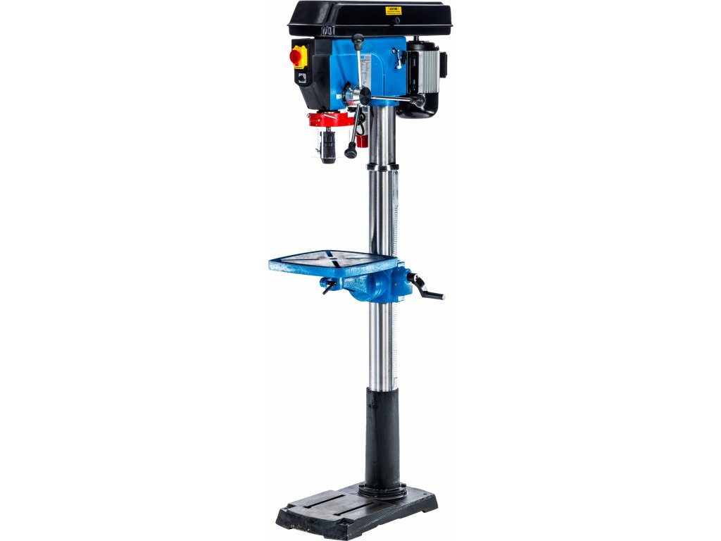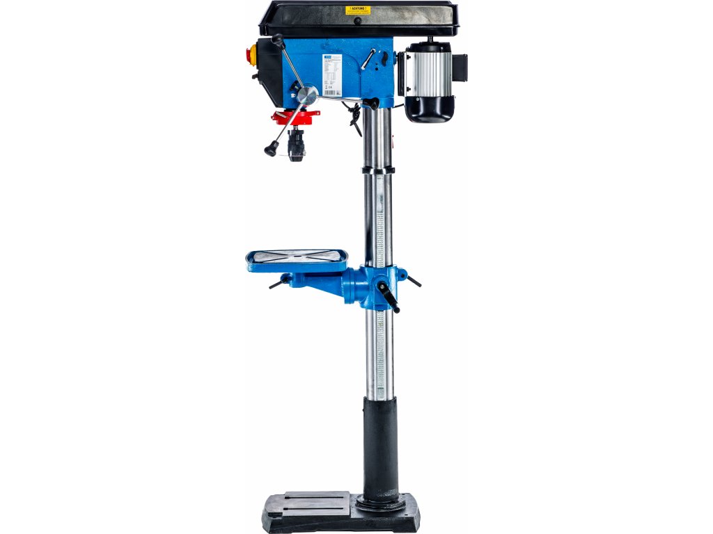 Robusna stupna bušilica profesionalne klase s steznom glavom za alate i svrdla do ø 16 mm, 16 brzina vrtnje vretena (ručno podešavanje putem remenica) i remenski pogon, dizajnirana za bušenje metala, drva ili plastike u bravarskim radionicama, servisima itd. Odabrani smjer rotacije (P/L rad), mehanizam nosača i zupčanika za podešavanje visine radnog stola. Blok elektromotora izrađen od aluminija, vreteno s konusnim prianjanjem MK2 / B16 i preciznim kugličnim ležajevima, štitnik vretena, graničnik dubine, glavni prekidač s nultim starterom, nagib radnog stola +/- 45 °, čvrsta osnovna ploča s uzdužnim T-utorima za stezanje poroka, radni stol s obodnim kanalima za rashladno sredstvo.