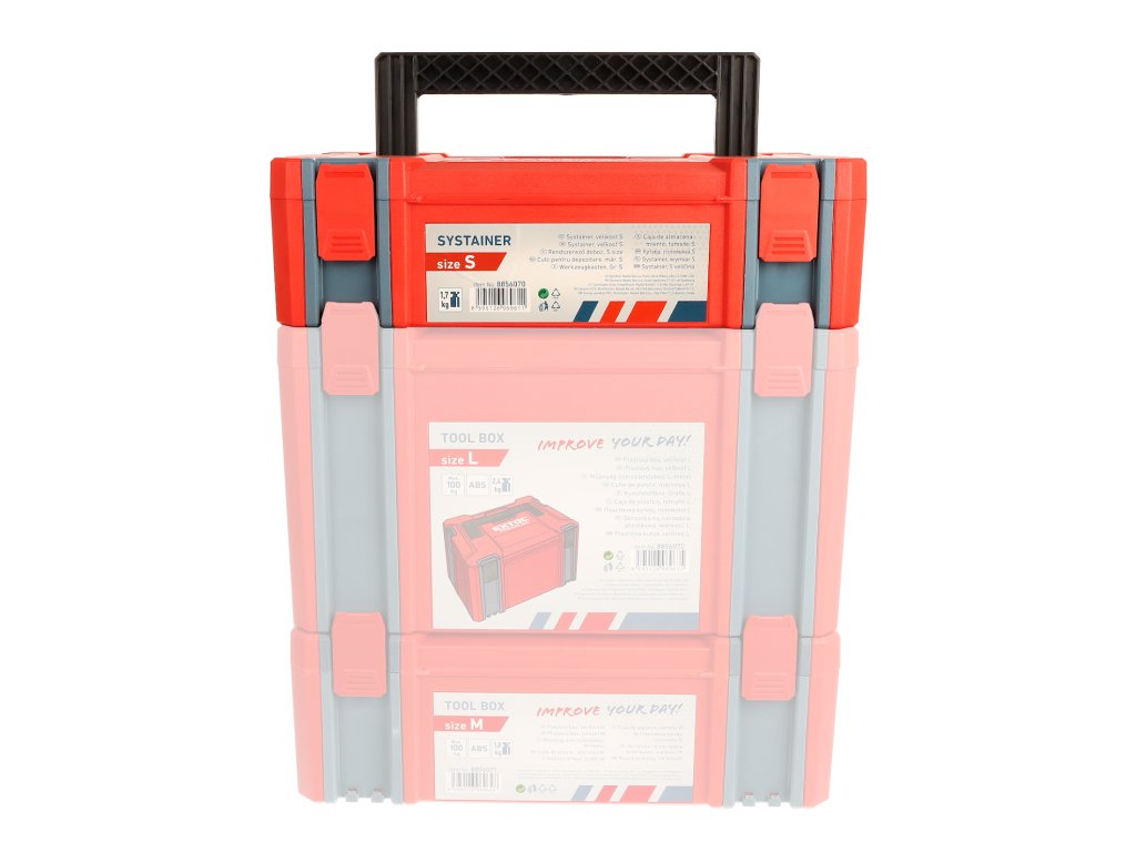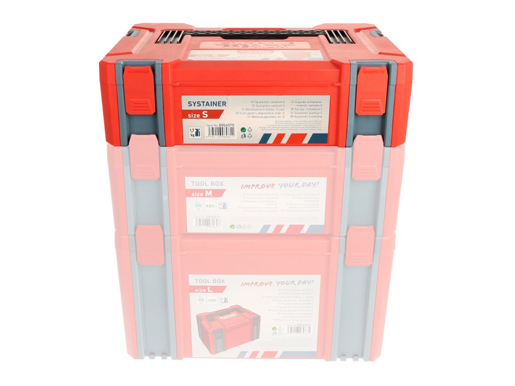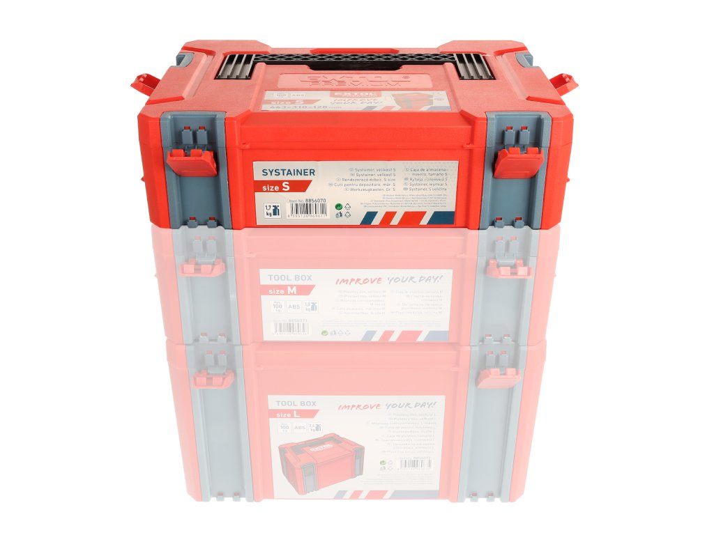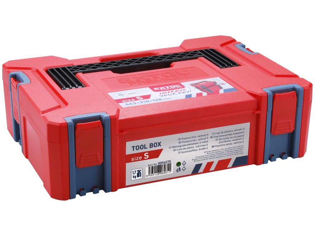 Izdržljiva plastična kutija (ABS) za spremanje i transport alata, veličine S. Vanjske dimenzije 443 × 310 × 128 mm, unutarnje dimenzije 427 × 292 × 95 mm, nosivost kutije do 100 kg, mogućnost čvrstog spajanja više kutija pomoću kliznih brava, veličina kutije L omogućuje pričvršćivanje kotača, što ga čini pokretnim, što je prednost posebno kada je spojeno više kutija.