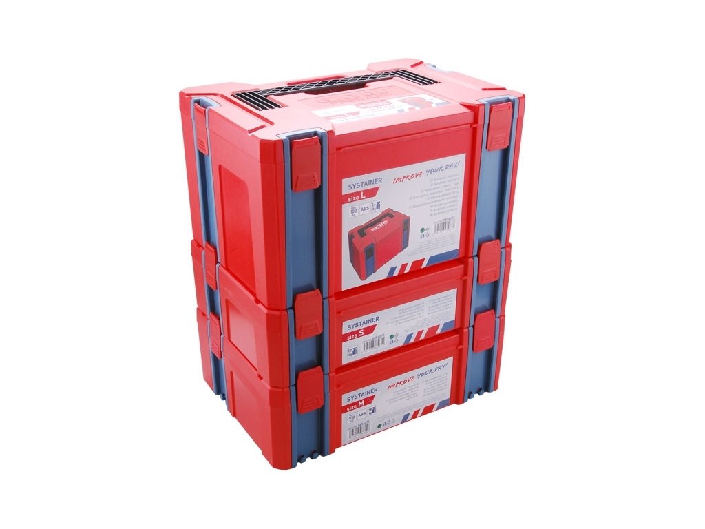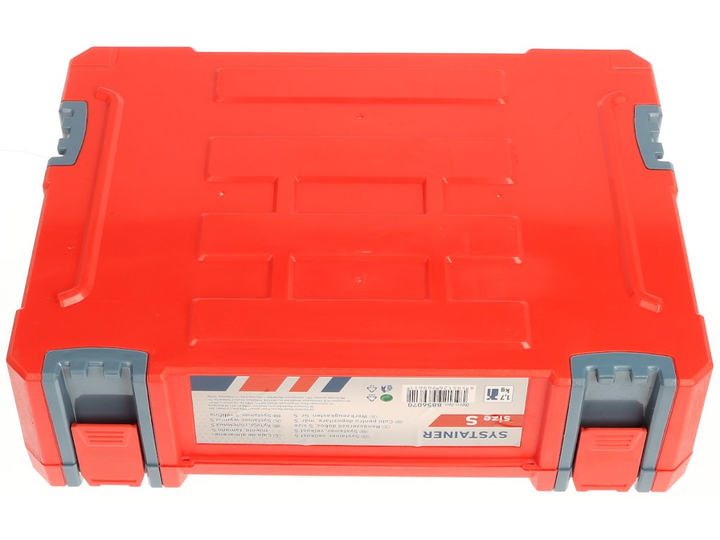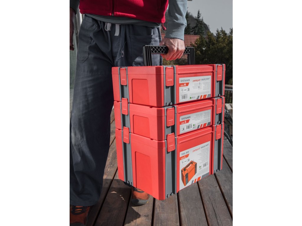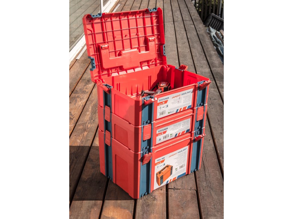 Izdržljiva plastična kutija (ABS) za spremanje i transport alata, veličine S. Vanjske dimenzije 443 × 310 × 128 mm, unutarnje dimenzije 427 × 292 × 95 mm, nosivost kutije do 100 kg, mogućnost čvrstog spajanja više kutija pomoću kliznih brava, veličina kutije L omogućuje pričvršćivanje kotača, što ga čini pokretnim, što je prednost posebno kada je spojeno više kutija.