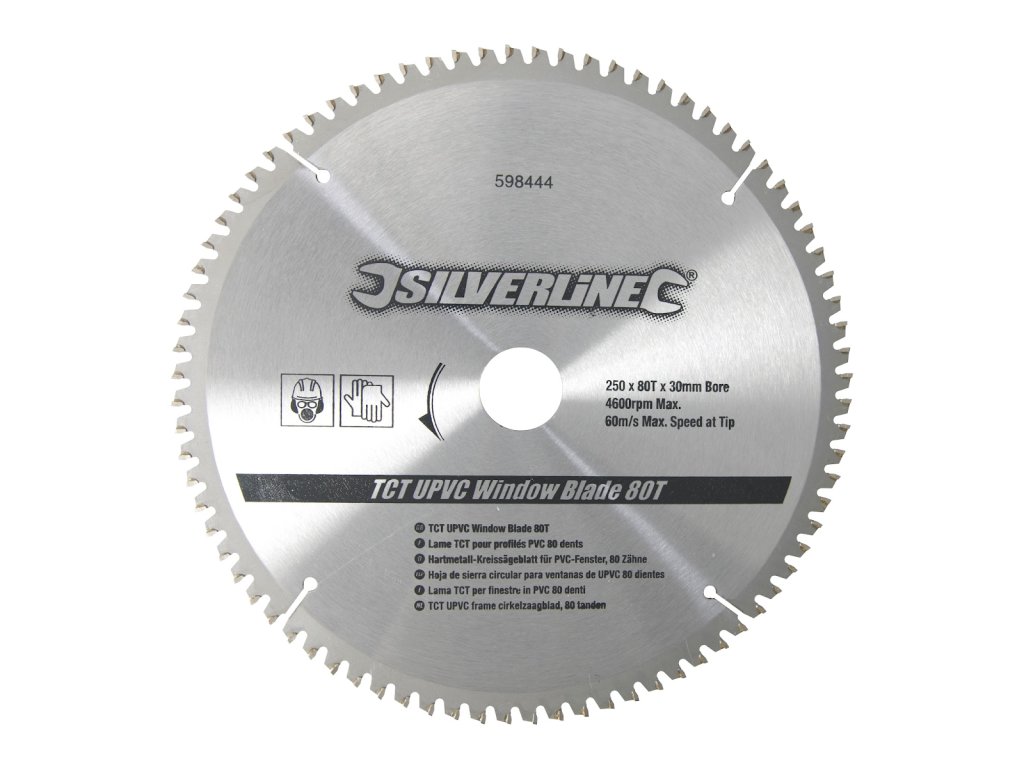 Za rezanje PVC lajsni, lagane legure i aluminija. 80 zuba volfram-karbida, -5° kut grablja. Stezna rupa od 30 mm sa smanjenjem od 25, 20 i 16 mm.