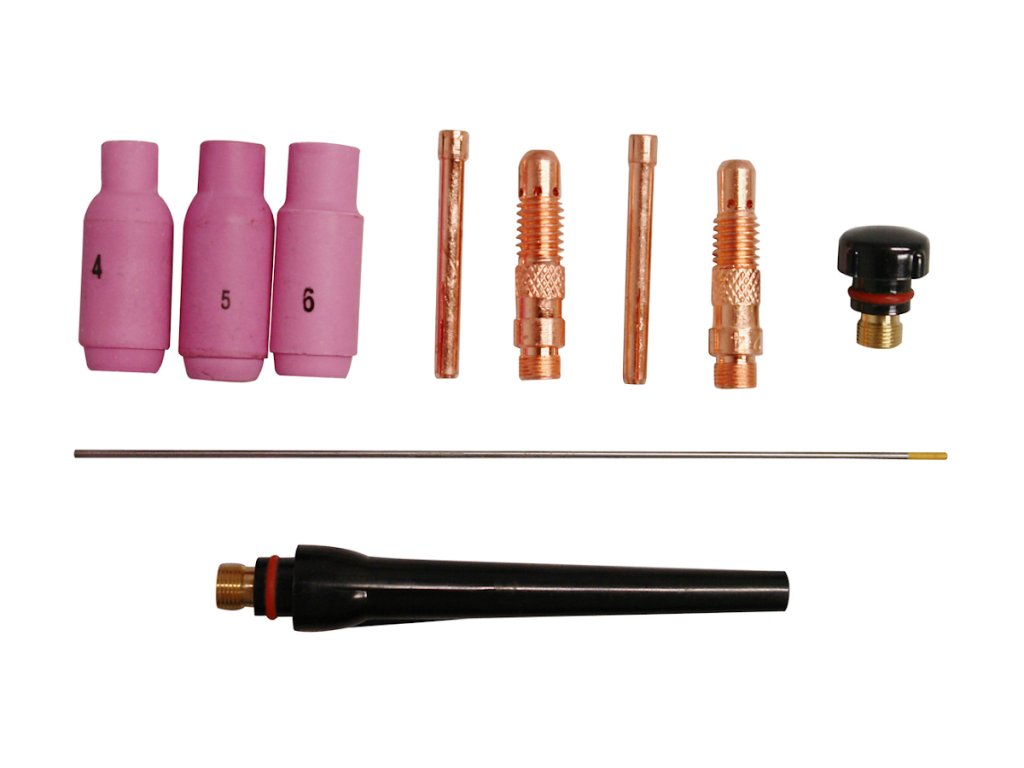 Sastav seta: volframova elektroda (1), 3 klizne keramičke mlaznice (→ 4,5,6), držači stezne čahure/elektrode (promjer →: 1,6/2,4 mm), poklopac elektrode kratki/dugi, Kabel za uzemljenje sa stezaljkom (→ bajunetni priključak DINSE 9).