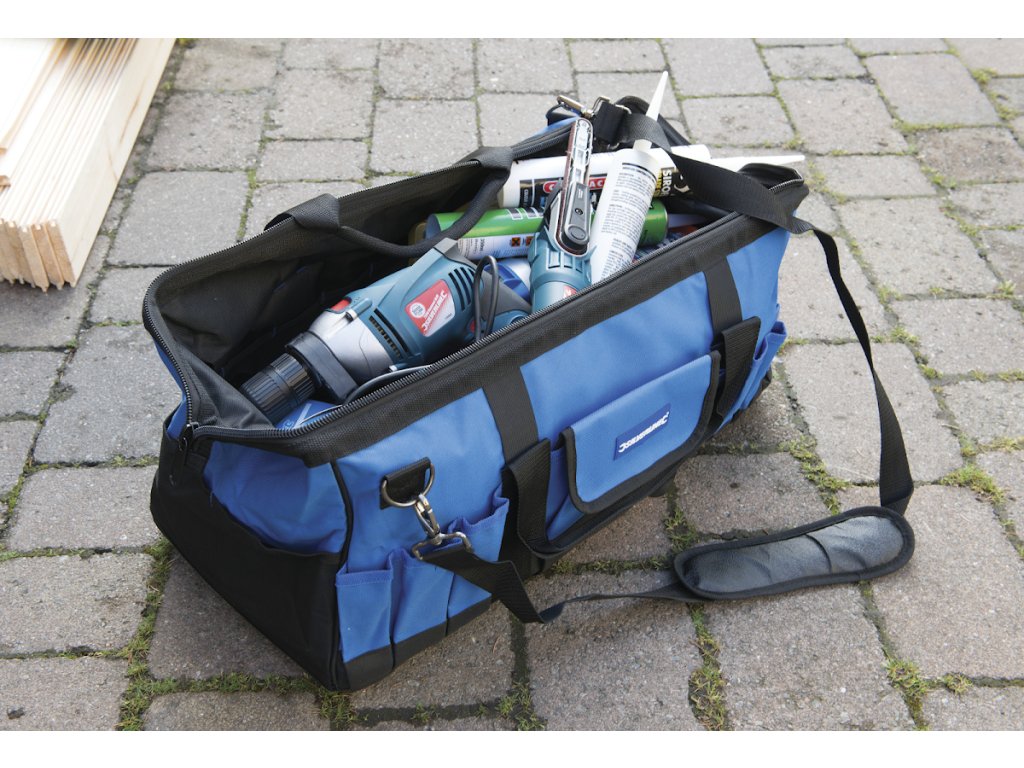 Čvrsta najlonska konstrukcija s tvrdim dnom, jakim šavovima i armaturnim klinovima na najnaglašenijim točkama. Uključuje 15 × vanjskih i 7 × unutarnjih džepova. Ojačane ručke i podesiva naramenica. Najlonski patentni zatvarač s uokvirenim otvaranjem.