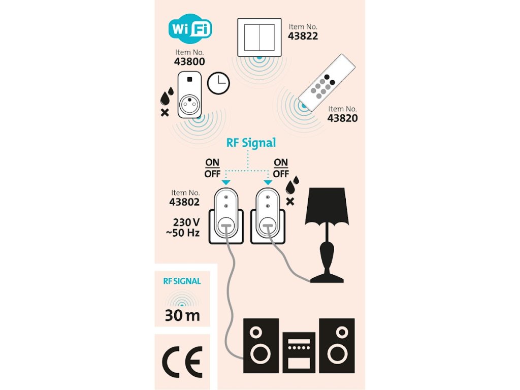 - max. 3680 W, funkcije: uključeno/isključeno, može se upariti s do 5 kontrolera, trajna memorija, LED indikator, 433,92 m Hz, 16A/230 V, bez daljinskog upravljača