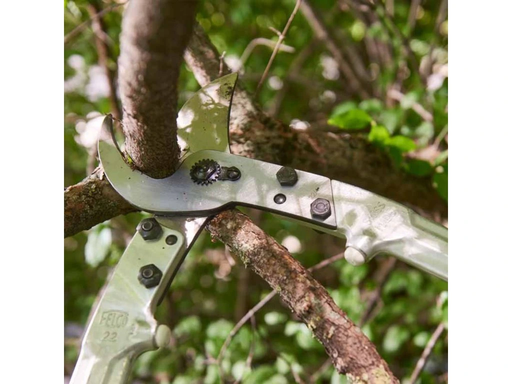 FELCO 22 škare za granje su snažan profesionalni alat koji s lakoćom može podnijeti čak i najtvrđe grane. Zahvaljujući robusnoj konstrukciji od kovanog aluminija i preciznom mehanizmu poluge, mogu rezati grane promjera do 45 mm bez ikakvog napora. Ergonomske ručke s gumenim amortizerima osiguravaju udoban hvat i smanjuju opterećenje na zapešća i ruke. FELCO 22 je idealan izbor za intenzivno orezivanje u voćnjacima, parkovima, šumarstvu i hortikulturi.