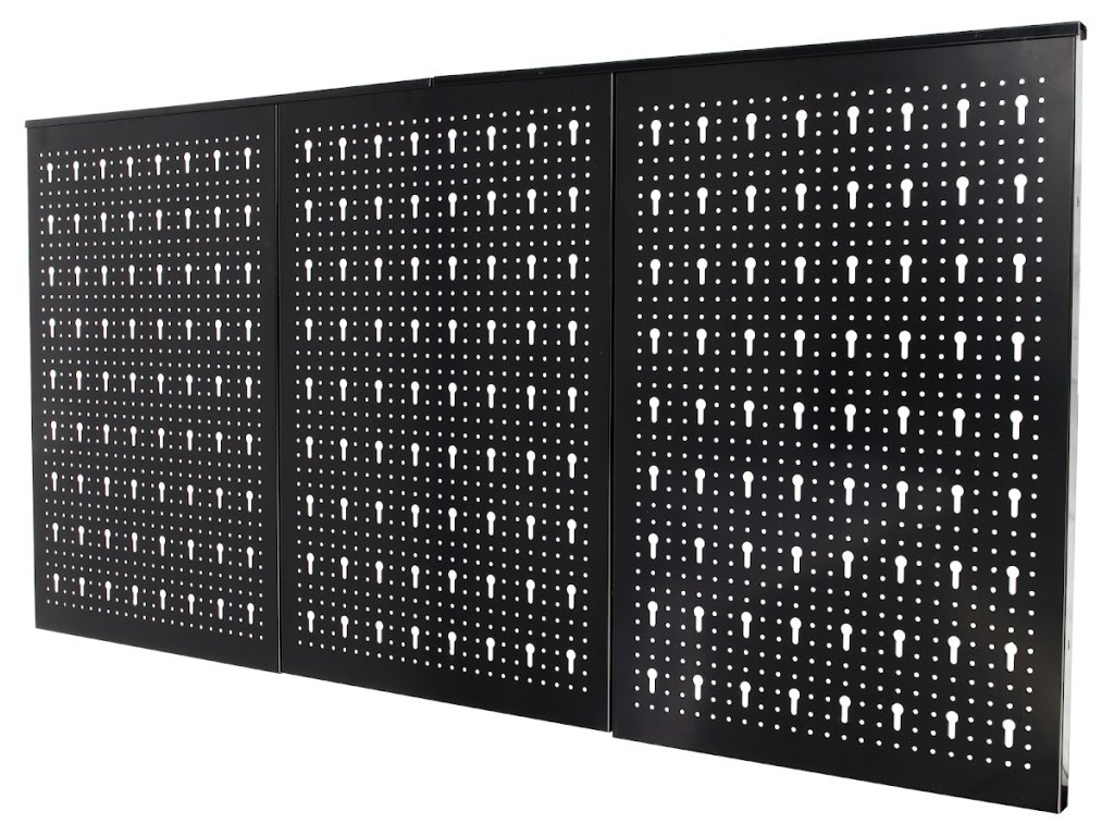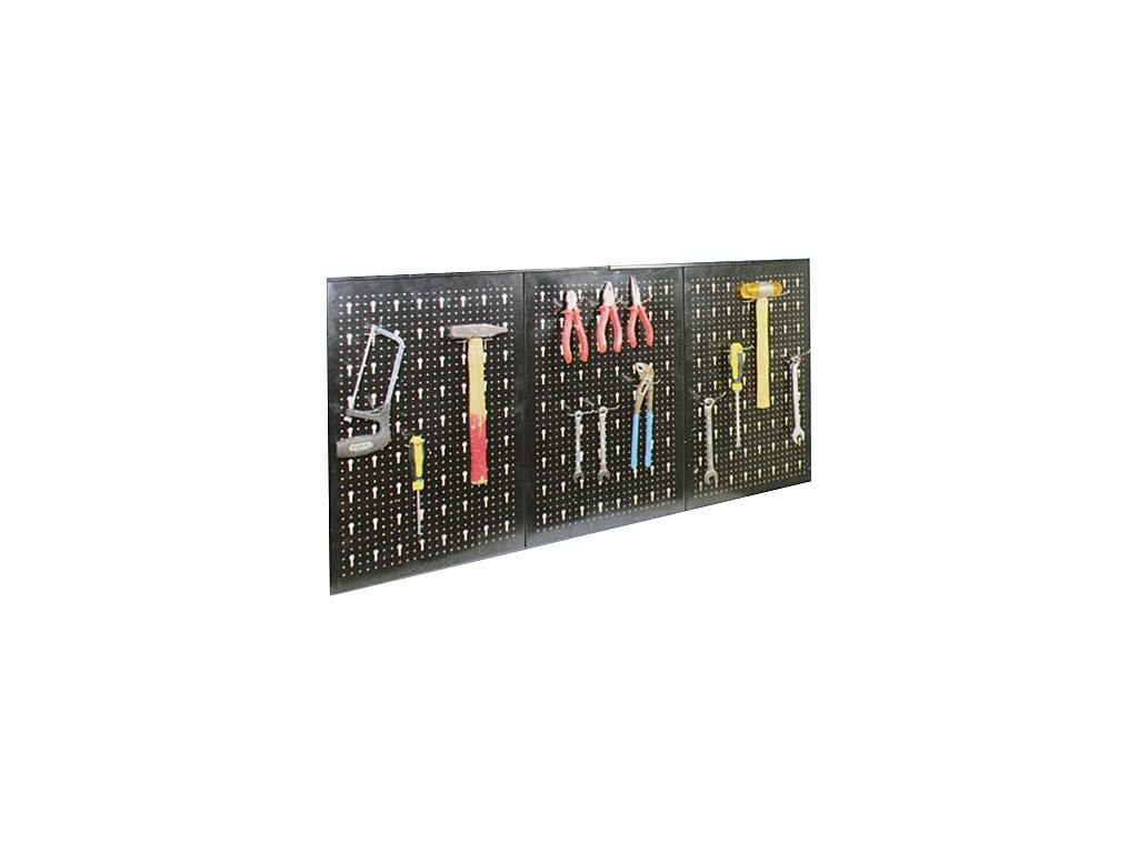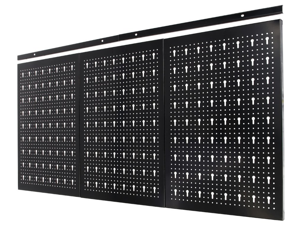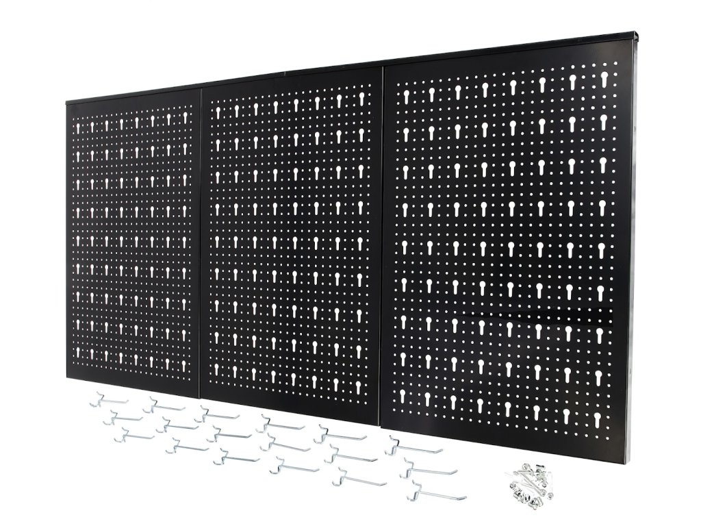 Set od tri perforirane ploče za uredno organiziranje alata i uređaja u vašoj radionici ili garaži. Ploče su izrađene od čeličnog lima debljine 0,8 mm i poprskane antistatičkom bojom. Svaka od ploča ima dimenzije 600 × 400 × 20 mm. U pakiranju se nalazi 18 metalnih kuka za jednostavno vješanje alata.