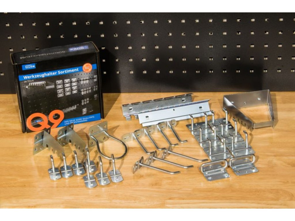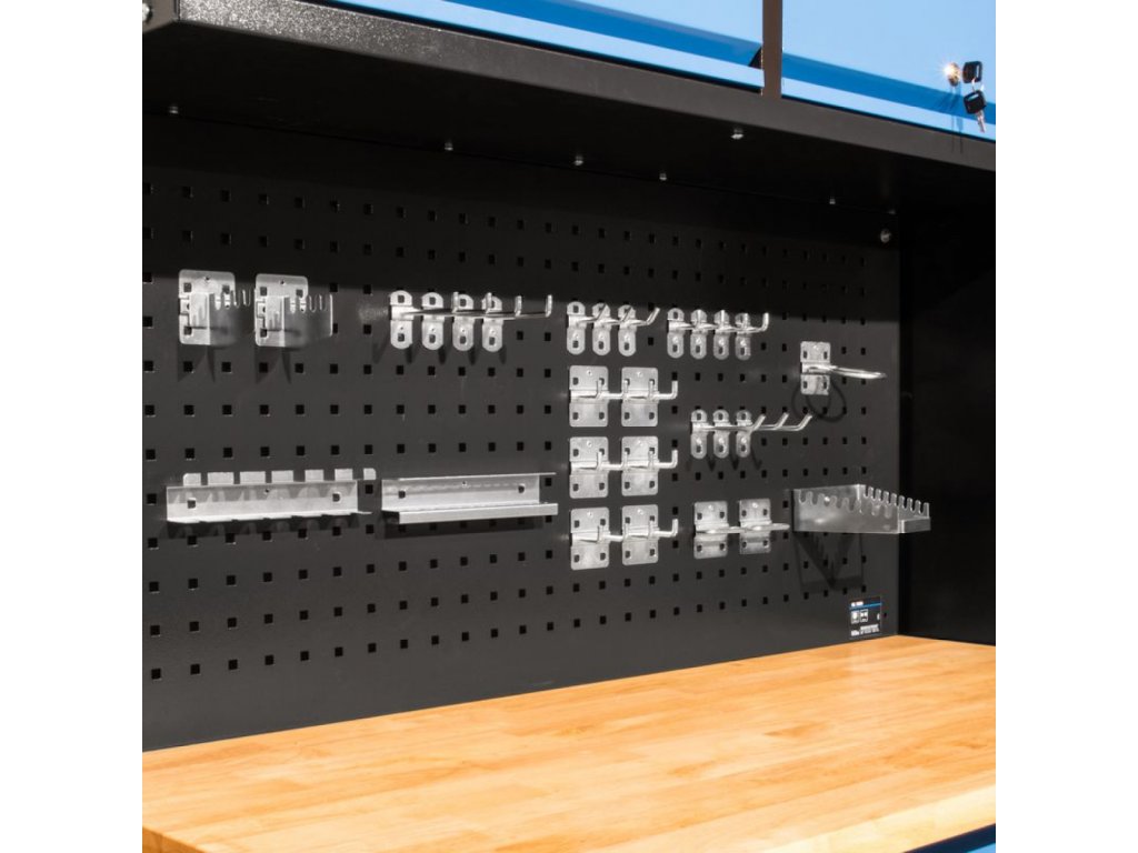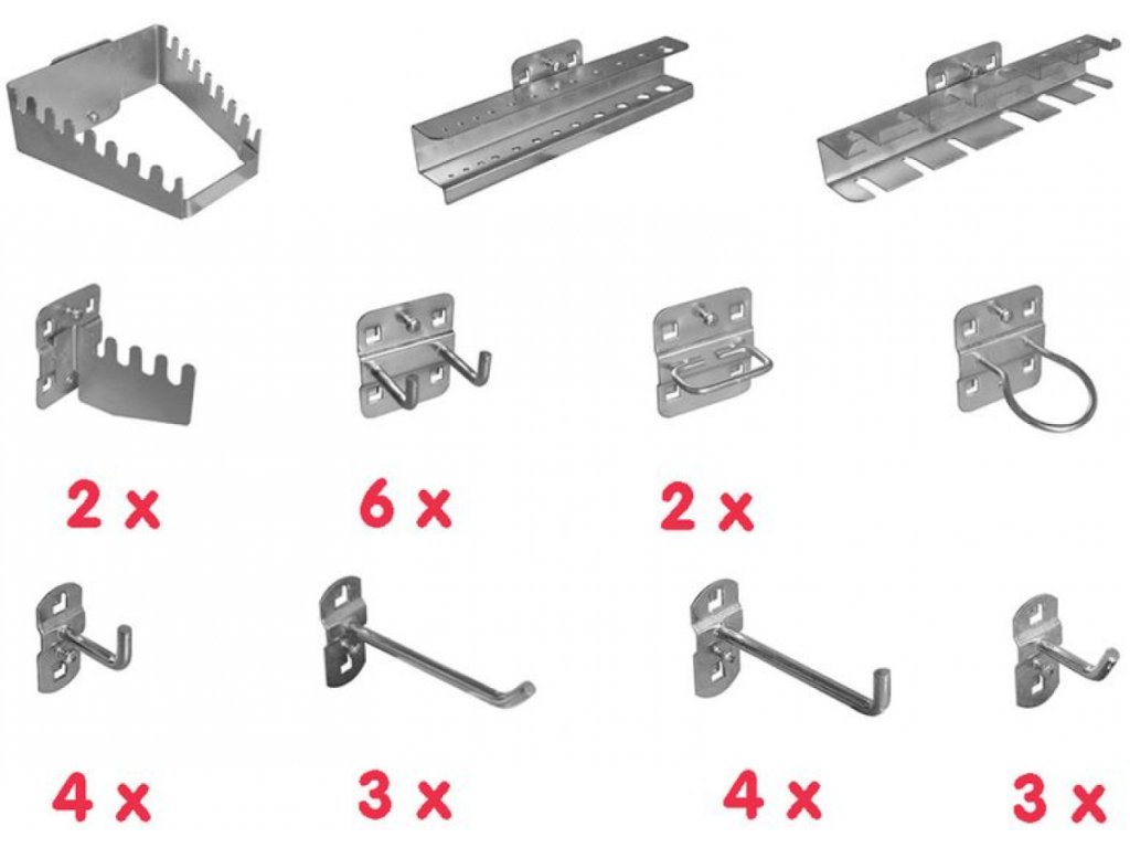 Skup od 28 kuka i držača, kompatibilan sa sustavima ovjesa radionice koji koriste kvadratne udarce od 10 mm² na vertikalnoj/vodoravnoj udaljenosti središta rupe od 38 mm.