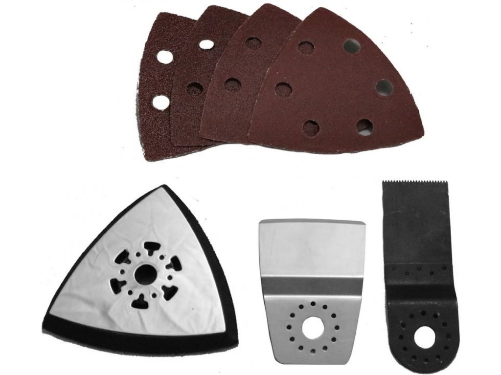 Pribor: trokutasta brusna ploča (→ 93 × 93 × 93 mm), delta brusne ploče (4), list pile izrezan uranjanjem, nož za struganje, transportna kutija.