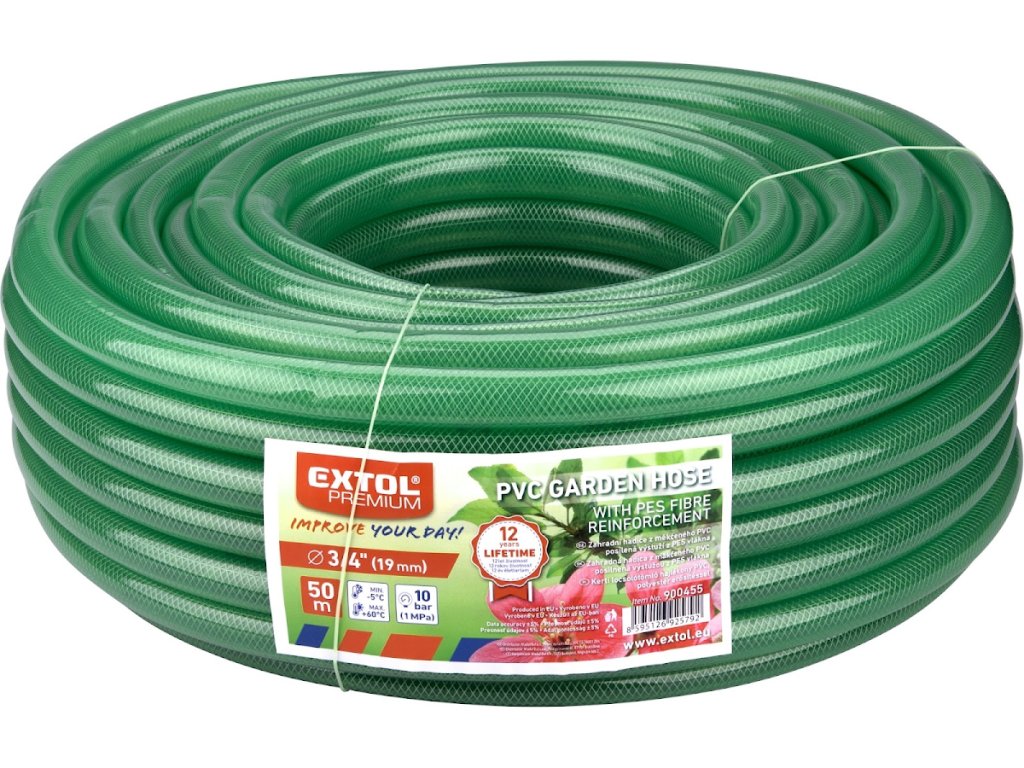 Visokokvalitetno vrtno crijevo izrađeno od omekšanog PVC-a ojačanog armaturom od poliesterskih vlakana.