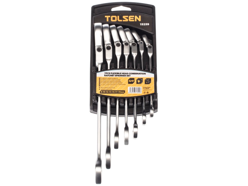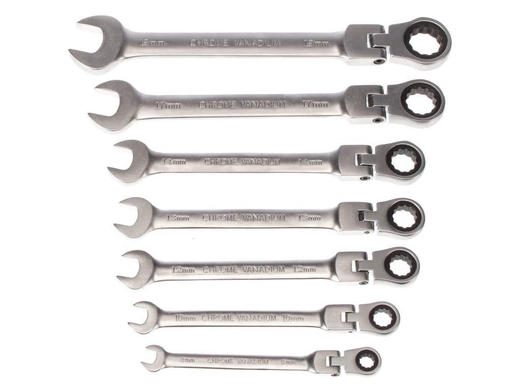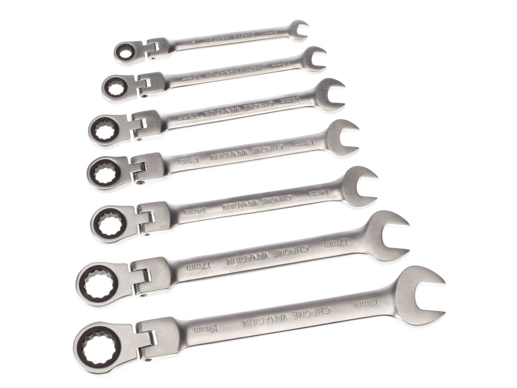 Skup ravnih i prstenastih ključeva sa zglobom, za lakše rukovanje na teško dostupnim mjestima. Ključevi su izrađeni od visokokvalitetnog kromiranog vanadijevog čelika. Set sadrži ključeve dimenzija 8 – 10 – 12 – 13 – 14 – 17 – 19 mm.