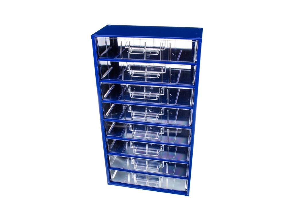 Viseći ormari mogu se slobodno postaviti, slagati jedan na drugi (baza je opremljena plastičnim nogama) ili objesiti na zid, prikladni su za uredno organizirano skladištenje sitnih predmeta, dijelova i ručnog alata. Izrađene su od čeličnog lima i opremljene izdržljivim praškastim premazom. Prozirne ladice izrađene su od izdržljivog PS (polistirenskog) materijala. Dimenzije: širina 306 mm, visina 551 mm, dubina okvira 145 mm, dubina uključujući prevjes ladice 155 mm. Broj ladica: 8 (57 × 276 × 136 mm).
